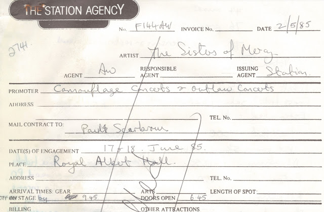 The documents comprised of a standard The Sisters of Mercy gig contract rider for all 1985 shows, and further contracts relating to this specific gig. As previously discussed, Andrew Eldritch had mentioned in an interview after the Stockholm press conference in mid-May that the band would be playing two nights at the Royal Albert Hall in June, and the first of Bruno’s recently-acquired contracts indeed regards engaging The Sisters for two nights at the London venue, with a show planned for Monday 17th June as well as for the following night when the gig actually took place. This contract was drawn up on May 2nd 1985, the night The Sisters played another famous show (in Rome, but I think that we’re all aware of that!) and was signed on behalf of Merciful Release/Troubadour (another offshoot based at the band’s All Saints Rd office in London, presumably separate for accounting purposes) by manager (and former Eldritch Oxford contemporary) Boyd Steemson. Almost certainly because of slow ticket sales for the announced gig on the 18th, this contract has two diagonal lines across it and the legend “cancelled”. With the band having toured the UK just a couple of months earlier, when the £3.50 ticket price also included the additional entertainment of The Scientists as support act, the cancellation of the second night is hardly surprising, given that press announcements only alluded to the fact that it would be the final gig of one band member (and in a New York interview a fortnight earlier, Eldritch had said “We’ve got one final date in Britain and it’ll be Gary’s last. A sort of memorial day in more than one way”) rather than the final chance to see any combination of the classic line-up, which is what transpired.